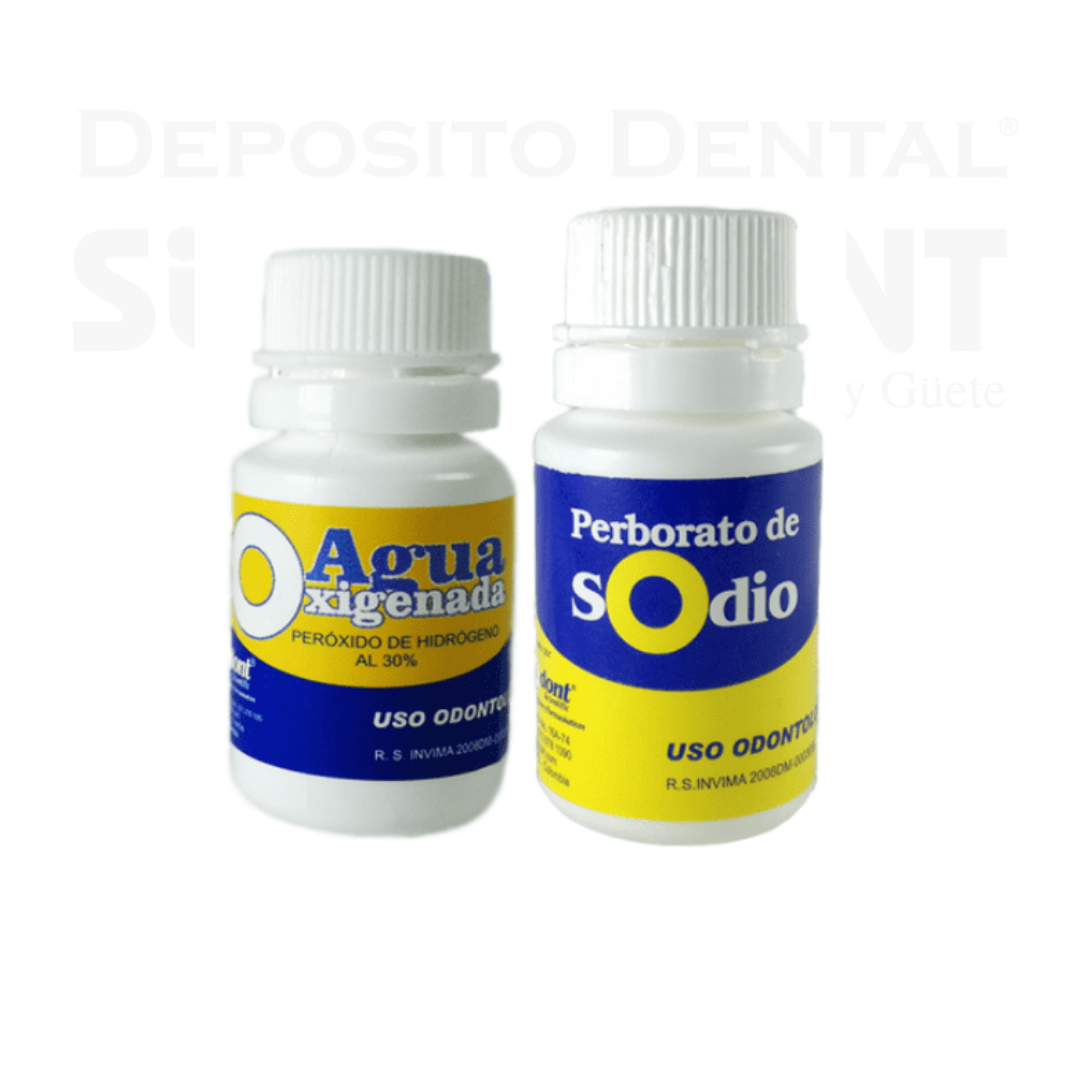 Agua Oxigenada 30% + Perborato de Sodio, la Mezcla se usa en dientes no vitales, para la decoloración de manchas producidas durante los tratamientos endodónticos.